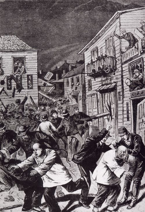 ▼不少報社跟風,影射華人婦女全是妓女,還說大部分華人男性都是皮條客、幫派打手。這樣的謠言迅速傳播,華人與當地人的隔閡、矛盾越來越深。1871年時,一名叫做Robert Thompson的男子捲入華人幫派鬥爭,遭槍擊而死。這件事引爆了當地人的仇視情緒,可怕的事發生了。