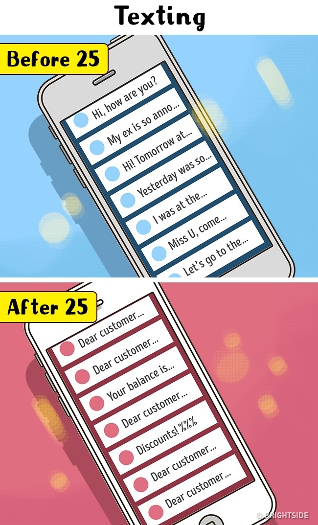 ▼25歲前超愛傳簡訊,朋友、約會對象、陌生人……每天都有新簡訊;25歲後收到的簡訊全是廣告。