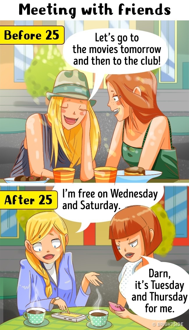 ▼25歲前隨便約,哪一天都能和朋友出去玩;25歲後找不到兩個人都有空的時間。