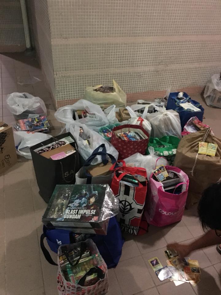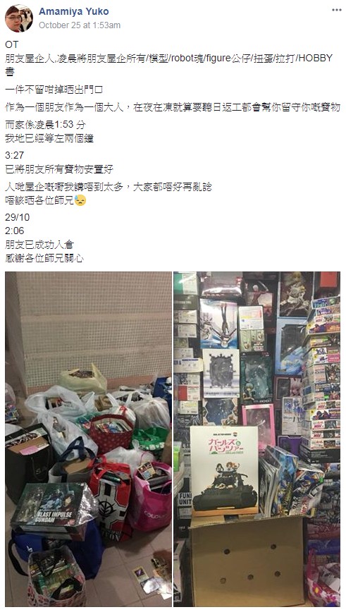 ▼這位講義氣的好友「Amamiya Yuko」在臉書社團上分享了這兩張照片,裡面就是朋友差點被家人全部丟掉的收藏品。原來10月25號這一天凌晨,朋友家人突然將他收藏的所有鋼彈模型、Figure公仔、轉蛋、限量品、模型書全部丟出門外,裡面許多袋子的價值都超過10萬元台幣。他在接到朋友的電話,知道朋友還在跟家人起衝突,家人不讓他出門去將這些收藏撿回來,於是他馬上跑到朋友家門口守著,這時已經超過12點了。