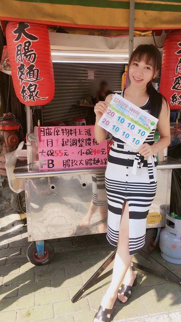 2017年10月31日前幾天,一名網友到嘉義市文化路夜市吃早點,看到一名賣大腸麵線的老闆娘時一下子驚呆了。這位老闆娘笑容燦爛,穿著粉紅色洋裝,搭配「恨天高」高跟鞋,白皙大長腿非常吸睛。