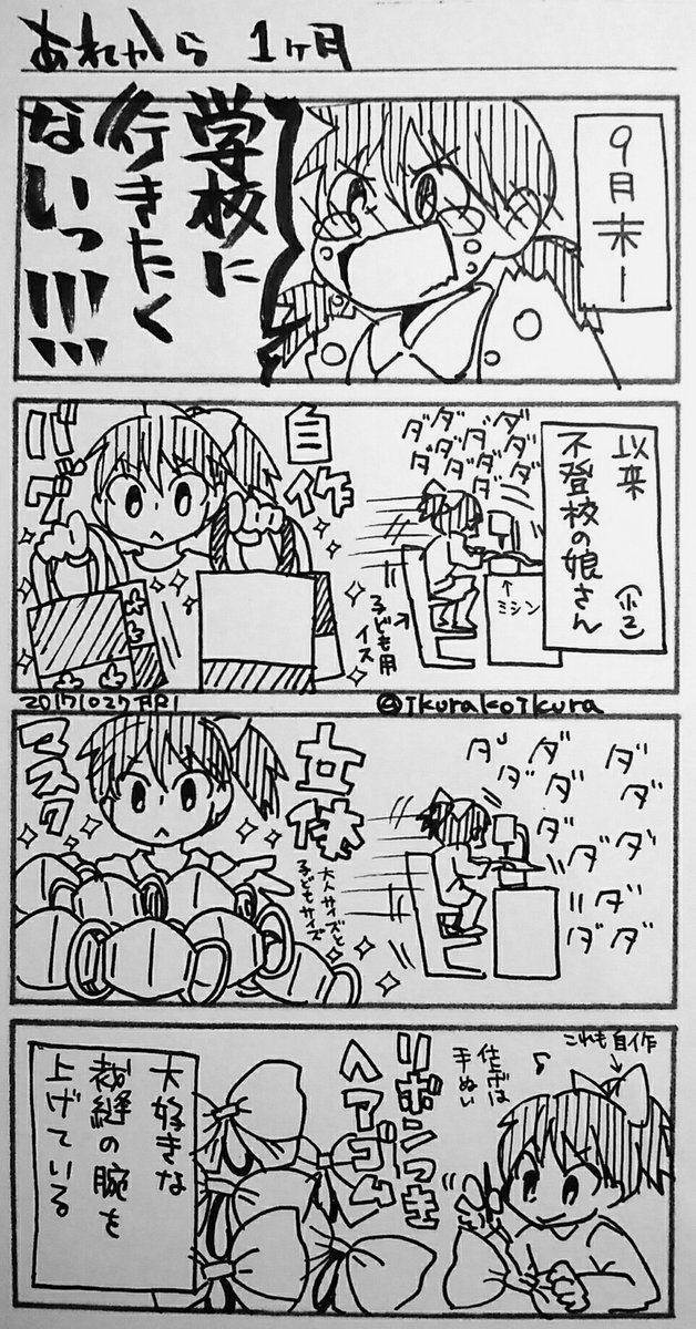 ▼日本網友「@ikurakoikura」在推特上分享了一則漫畫,道出自己女兒因為壓力太大而不想上學,於是自己讓她在家磨煉縫紉技術的事跡。