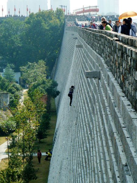 ▼​原來這位大媽是南京本地人,從小就爬這道城牆玩,經驗豐富,現在年紀大了,爬起牆來還是身手靈活,動作敏捷,最快2分鐘就能登頂。看到大媽爬得輕鬆,幾名男士也想挑戰一下,結果發現難度很大。