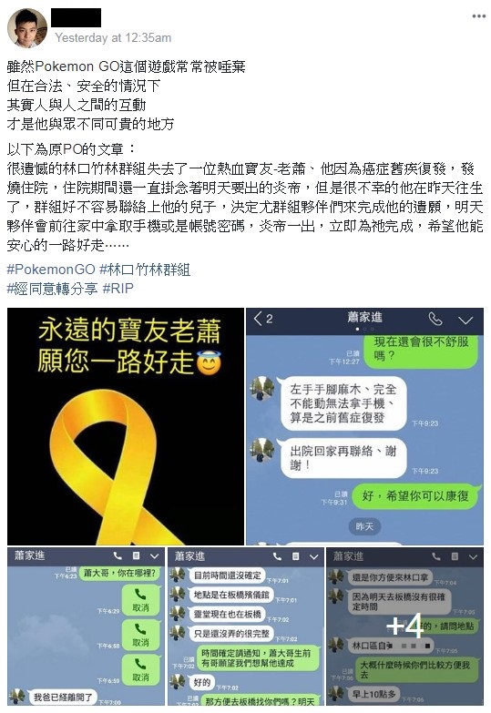▼日前LINE群組「林口寶可夢竹林群組」的創辦人兼管理員蔡章明就在網路上分享了一件感動人心的事跡,原來群組中的一位寶友「老蕭」在10月30日突然因為癌症復發而發燒住院,而他躺在病床上時仍然念念不忘想要抓到「炎帝」。