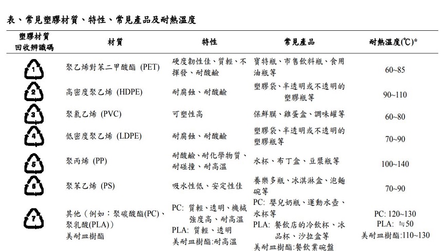 ▼根據衛福部食藥署提供塑膠材質的表格,可以看到各個號碼所對應的塑膠材質,以及它們的特性和耐熱溫度,可以耐高溫的屬於「5號」,所以在使用相關產品時也可以多注意!