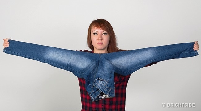 ▼量長度:兩手抓住牛仔褲褲腳,向兩側打開,如果褲襠正好對準你的下巴,說明這個長度沒問題。