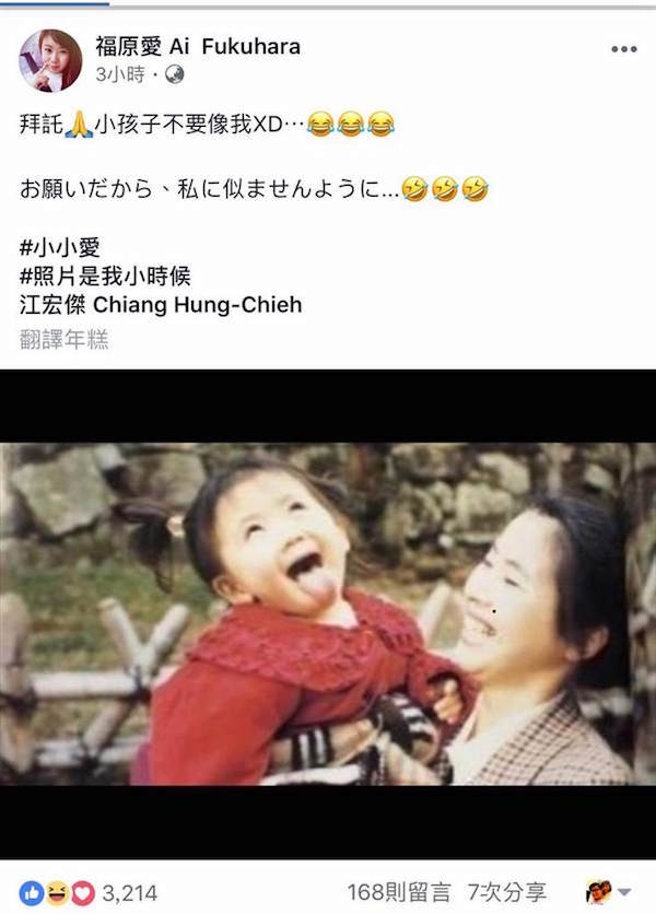 ▼江宏傑表示小小愛「越來越像媽媽」,而福原愛也在臉書貼出自己小時候的逗趣照片,開玩笑說:「拜託,小孩不要像我XD」網友也熱烈回應:「像很可愛啊!小愛小時候真的超級可愛的~」、「一定要像媽媽,super cute!」、「小小愛一定有乃母搞笑之風XD」