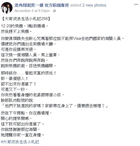 ▼根據臉書粉絲頁「浩角翔起笑一個 官方粉絲專頁」的分享,日前浩子帶著家人提早了3個小時抵達機場,卻因為海關人員的刁難,讓他趕不上飛機,只能無奈看著飛機飛走。