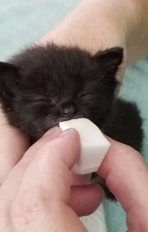 ▼如果再不進食,小貓就會有生命危險了,突然朋友想到一個好主意,他剪下一小塊海綿,用它吸滿給小貓的營養品,結果小貓看到海綿,竟然沒有拒絕,而是不停的吮吸起來。用這個辦法,小貓獲得了足夠的水分和養分,身體一天天恢復了起來。
