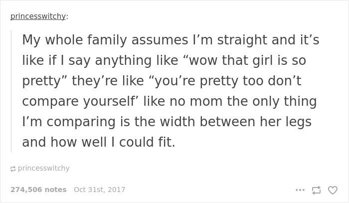▼「我全家人都以為我是直女,所以每當我說了像是:『哇那女生好漂亮』他們就會說:『你也很漂亮,不要一直比較。』其實我唯一比較的事就是她們兩腿之間的寬度和我要怎樣跟她【合體】。」