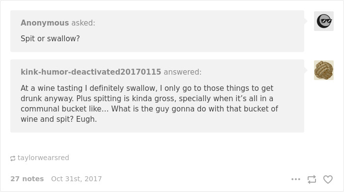 ▼「吞下還是吐出來?」「在試酒時我絕對就是吞下去,我就是為了喝醉才做的。加上喝了酒吐出來不是很噁心嗎?什麼人會準備一個桶子將酒吐在裡面?」