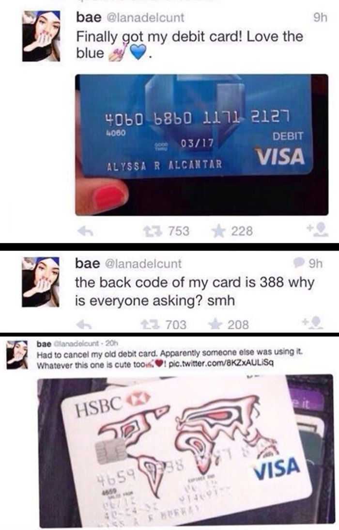 ▼「終於拿到我的金融卡了!喜歡那個藍色!」「我後面的數字是388啊,為什麼大家都在問?」「必須停用我的金融卡,因為它被盜用了!另外這張卡也不錯!」