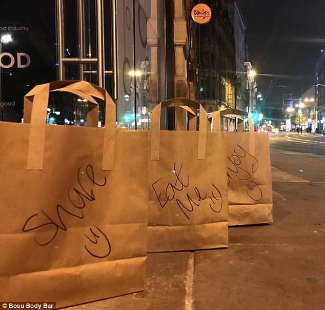 ▼把這些淘汰的食物丟掉太可惜,他們注意到街上有很多無家可歸的人,就在臉書發文說:「我們打烊時會把裝滿美味食物的袋子放在門口,如果你看到街頭有人需要幫助,就告訴他們袋子裡有好吃的。」這件事很快就引起了網友們的關注,大家紛紛稱讚。