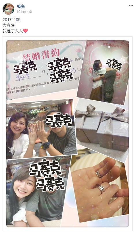2017年11月09日台灣女藝人邵庭與暱稱「閃光哥」的圈外男友交往了3年多,不僅從未分享過對方的正面照片,就算有照片也會將對方的臉打上馬賽克。不過她終於在11月9日的凌晨時分於臉書上大方po出兩人的「公證照」,還寫道:「大家好,我是丁太太❤」,正式宣告升格為人妻。