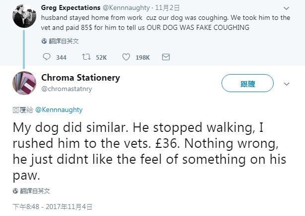 ▼之後蘇利再也沒有發出那種奇怪的咳嗽聲,當兩人又帶了蘇利到獸醫那裡做檢查時,獸醫表示動物有時候會為了引起主人的關注而假裝生病或跛腳。兩人經過討論之後,認為蘇利是為了想要得到他們的關注,才故意做出一些不一樣的動作,好讓主人們請假陪著牠。