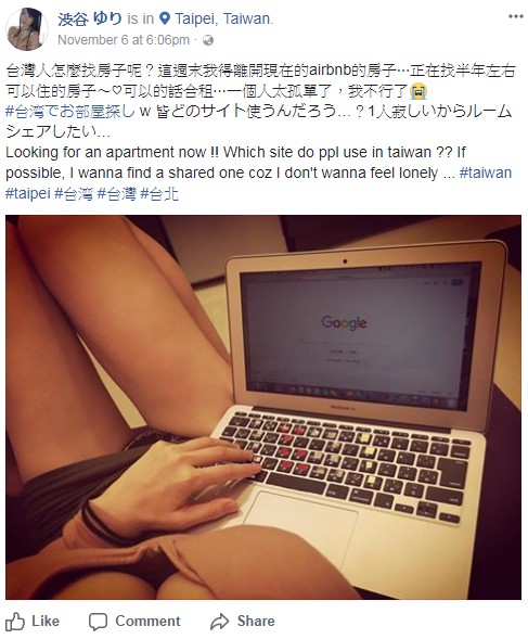 ▼近日她在臉書上發了一則貼文,苦惱表示「台灣人怎麼找房子呢?這周末我得離開現在的airbnb的房子,正在找半年左右可以住的房子,可以的話合租…一個人太孤單了,我不行了!」短短的幾句話就讓許多網友決定要幫助她!