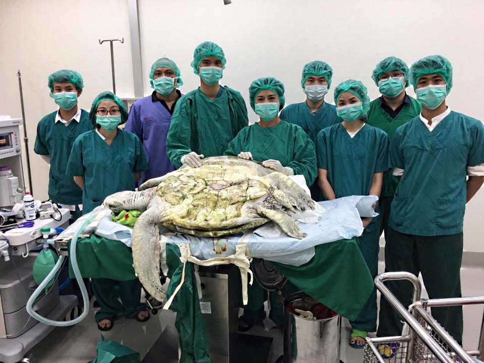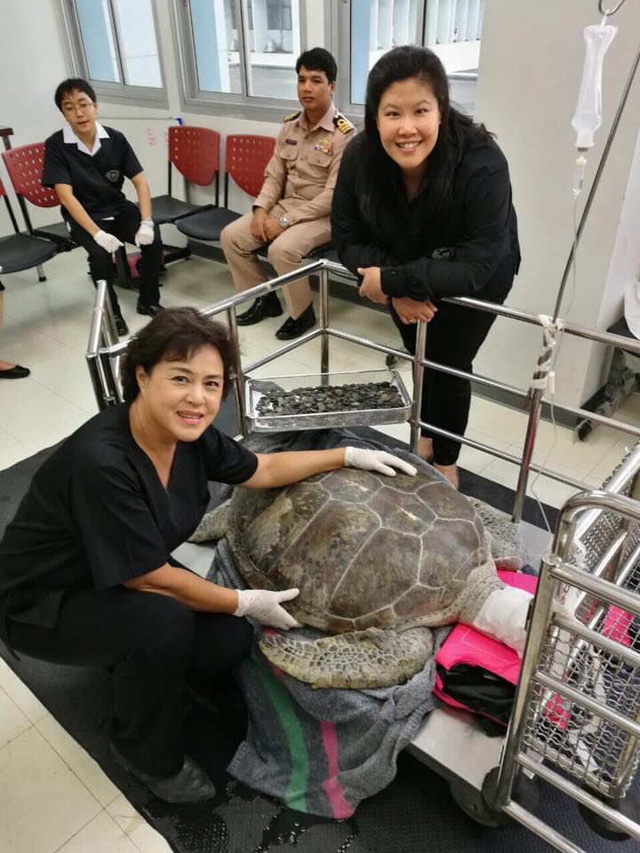 你曾經往許願池裡扔過硬幣嗎?這聽起來很浪漫,但對住在池子裡的生物來說,就不是什麼好事了。泰國東部城鎮有一隻25歲的海龜,叫Om Sin,牠和其他25隻海龜一起,住在一個池塘裡。最近池塘附近要規劃建設,為了保證海龜們不受影響,有關部門給海龜們檢查了一下。