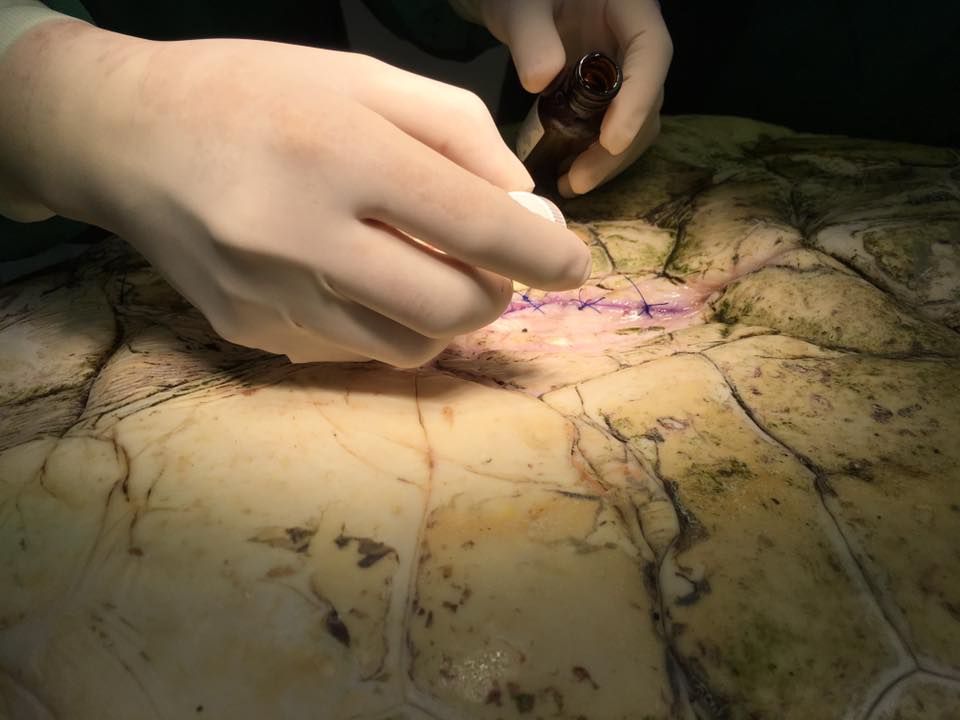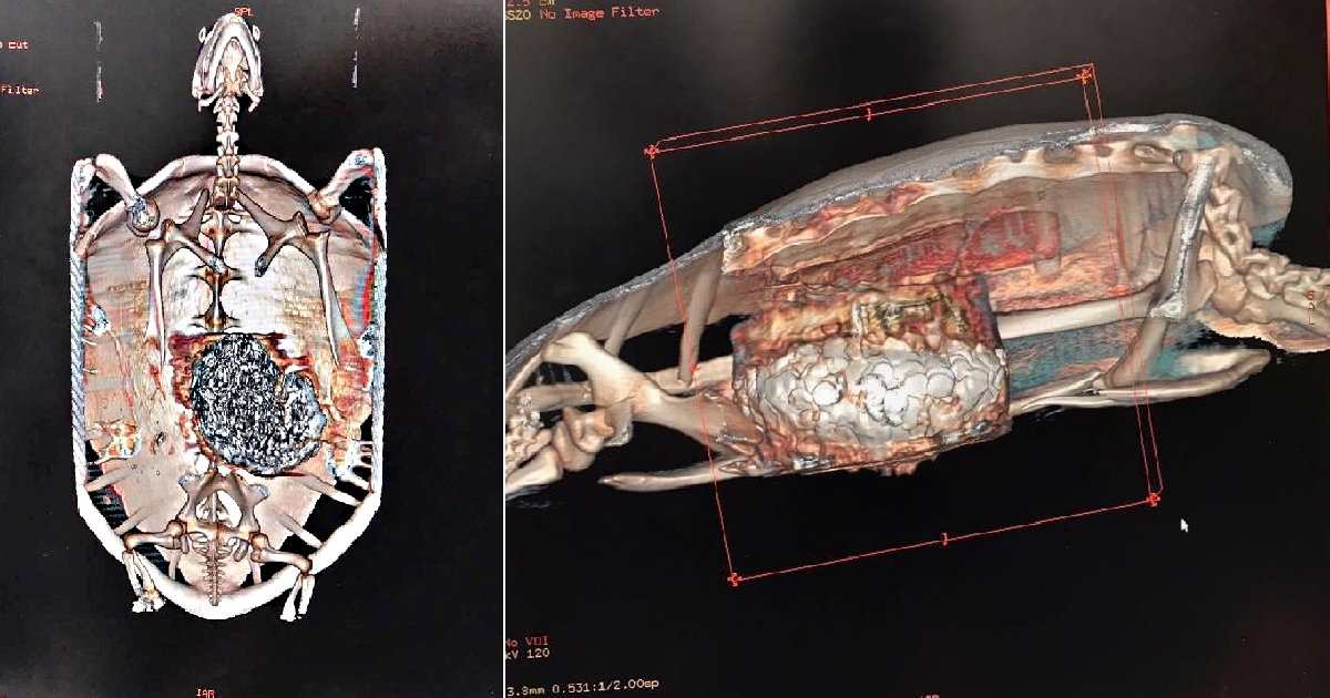 ▼他們發現Om Sin很不對勁,通過CT掃描可以看到,牠的腹部有奇怪的腫塊,這個腫塊已經撐破了龜殼,導致感染。剛開始他們以為Om Sin長了腫瘤,但很快就發現不是那樣。