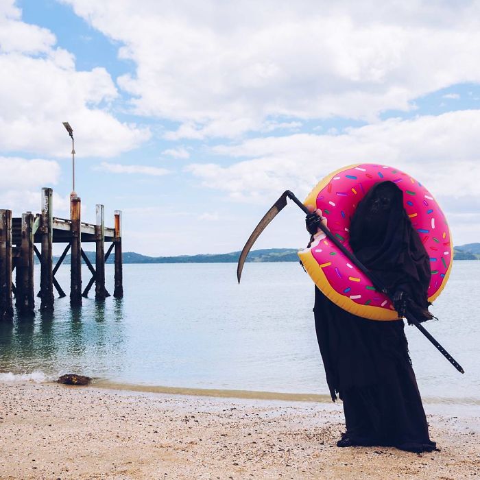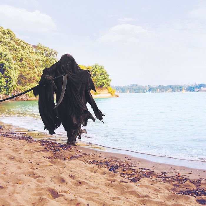 紐西蘭作為島國可以親密的接觸海水,因此在這個國家海邊放鬆是非常普遍的娛樂項目。最近在IG上的一個叫作「The Swim Reaper」的帳戶引起了大家的關注,一個恐怖的「死神」形象出現在各個海灘,手中的大鐮刀更是讓人感到害怕。