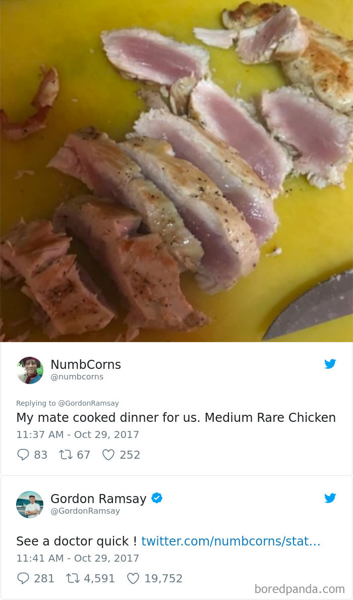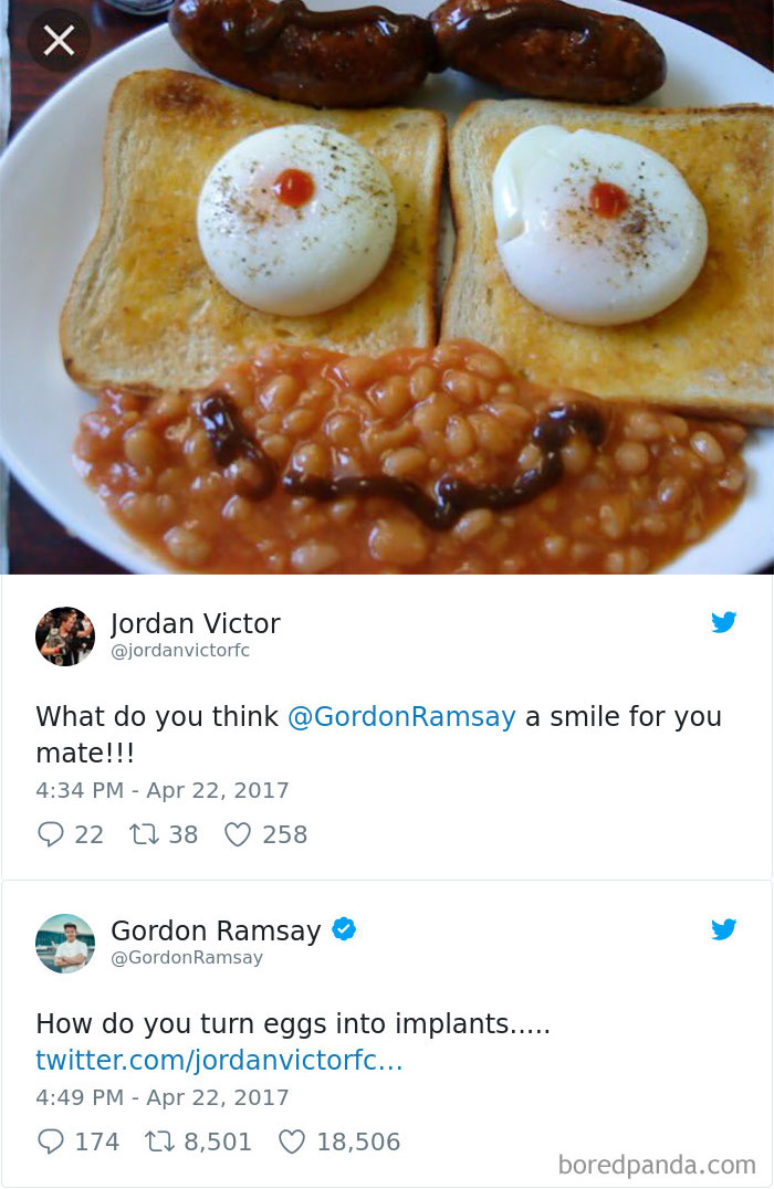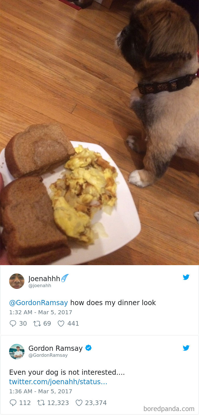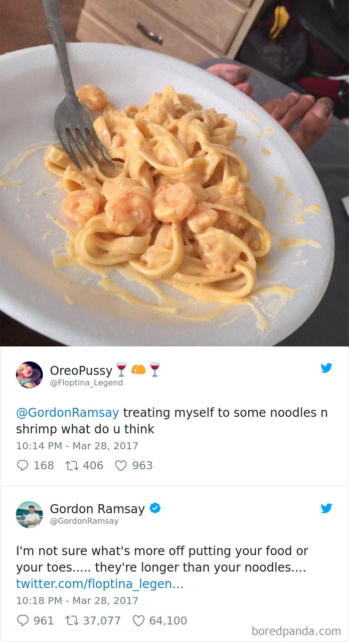 米其林三星主廚戈登拉姆齊(Gordon Ramsay)素有「地獄廚神」之稱,在烹飪節目上對嘉賓嚴厲和毒舌,追求完美的性格讓他名聲大噪。但是還是有不怕死的網友把自己做的料理PO到網路上讓他品鑒,看到回覆後,相信他們應該都會後悔做這件事了。