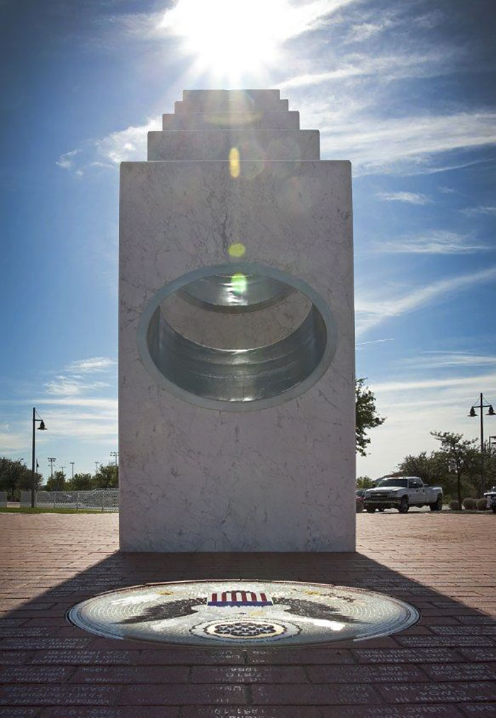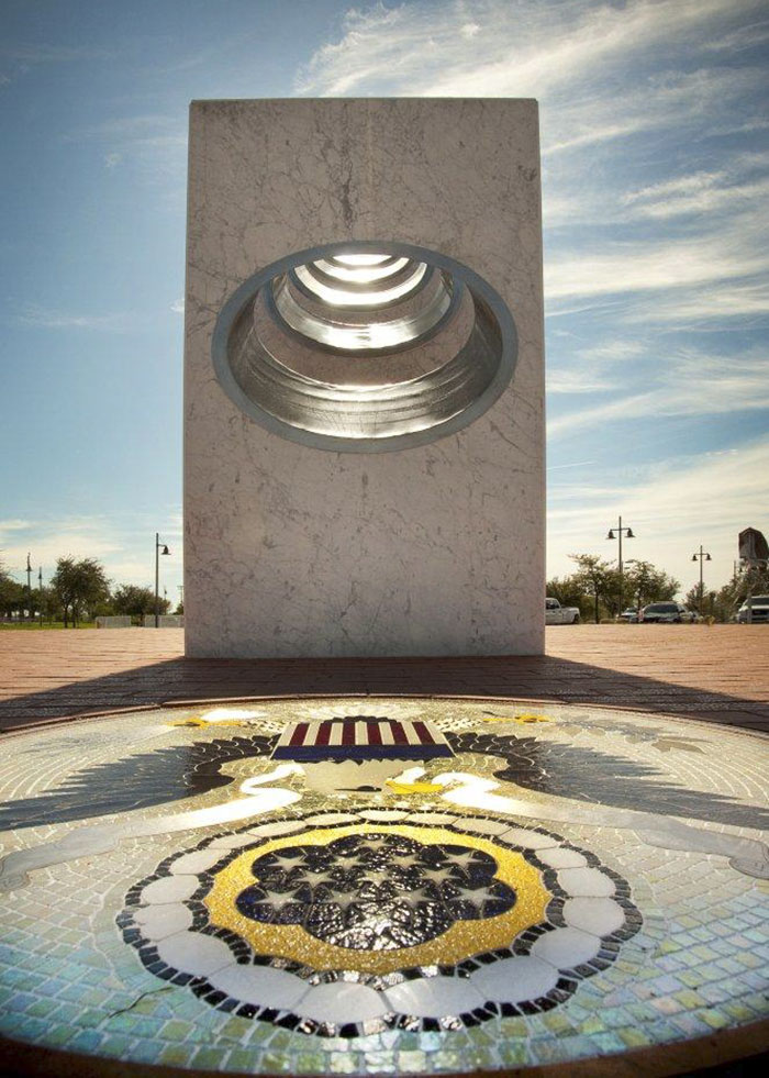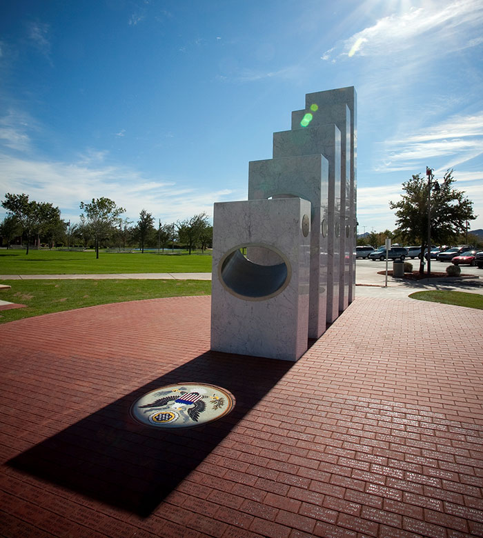 ▼退伍軍人紀念碑由5塊大小不一的大理石組成,這些大理石代表著美國陸軍、美國海軍陸戰隊、美國海軍、美國空軍和美國海岸警衛隊,上面裝飾著各個軍種的專用徽章,順序是依照美國國防部的規定來排列的。