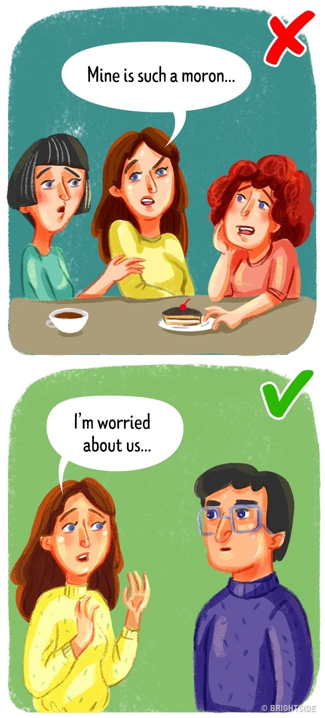 ▼不要在背後說對方的壞話:不要向父母、朋友訴苦,說你的另一半多差勁。矛盾解決後,你會忘記自己說過的話,但別人卻記得清清楚楚,他們會覺得你的另一半很差勁。遇到問題和你的另一半溝通,不要把別人牽扯進來。