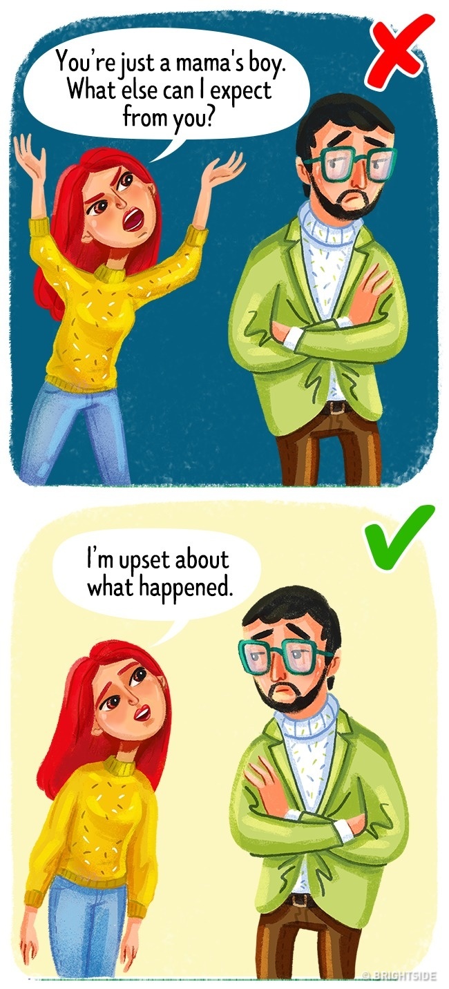 ▼控制情緒:你可以發脾氣,但不能侮辱對方。感覺自己控制不住時,深吸口氣,然後出去散步。不要冷戰,也不要口出惡言,冷靜下來後再談。