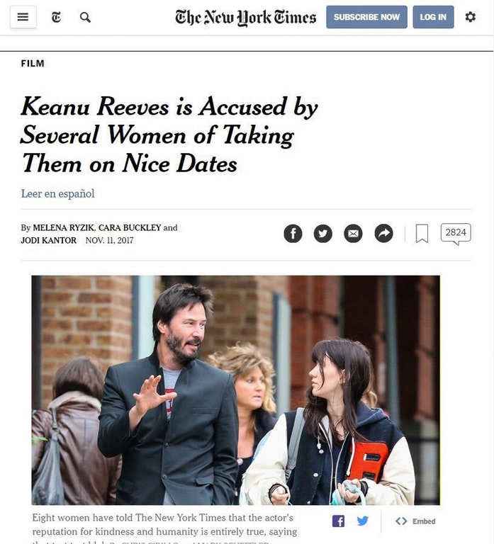 近期許多好萊塢醜聞接二連三的被爆出,許多大牌男星、導演、總裁都被爆有過性騷擾、潛規則等負面新聞,讓許多好萊塢男星人心惶惶。不過近日有網友在美國網站《Reddit》分享了一則《紐約時報》的新聞,標題寫道:「基努李維被多位女性指控帶她們享受了美好的約會」!