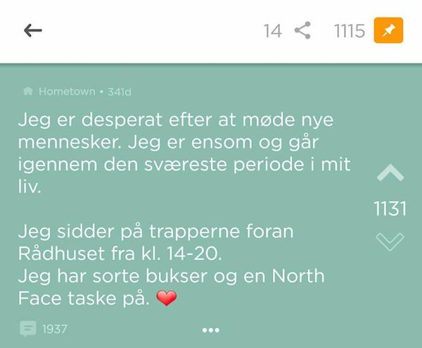 ▼2016年12月7日,丹麥男子派翠克(Patrick Cakirli)在社群網站寫下:「我很渴望交到新朋友,我非常孤單,正在經歷人生中最難熬的時光。今天下午2點到8點這段時間裡,我會坐在市政廳的階梯上。我身傳黑色長褲,背著一個North Face的包包。」