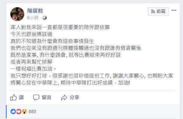 ▼不過就在陽岱鋼貼文發酵後,陽耀勳也貼文軟性回應:「家人對我來說一直都是很重要的陪伴跟依靠,今天也跟爸媽談過,真的不知道為什麼會有這些事情發生,我們也從來沒有跟週刊媒體接觸過也沒有跟誰有借貸關係。既然是家事,有什麼誤會,就等比賽結束再好好談,或者再來幫忙排解。」否認陽岱鋼指涉的借錢、爆料一說。