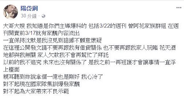 ▼陽岱鋼在深夜時難得發文說:「大哥大嫂,我知道是你們主導爆料的,包括3/22的週刊、曾阿花家族群組,在週刊開賣前3/17就有家醜內容流出。一直保持沈默是我沒見到證據不願意懷疑,在這裡公開發文,請不要再跟我有借貸關係,也不要再跟我家人玩賭,花天酒地都與我無關,家人欠款我不會再幫忙了拜託。」