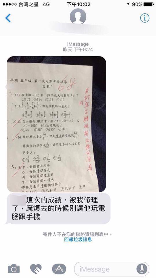 ▼還有一張照片中附上了孩子這次考卷的分數「68分」,還有前妻的囑咐:「XX這次的成績,被我修理了,麻煩去的時候別讓他玩電腦跟手機。」不過許多網友都被旁邊老師所寫下的紅字給吸引了:「考試時寫字轉頭舉高讓同學看」,引起了網友的議論,許多人都認為小孩是因為作弊才會被打!