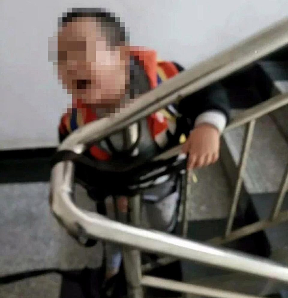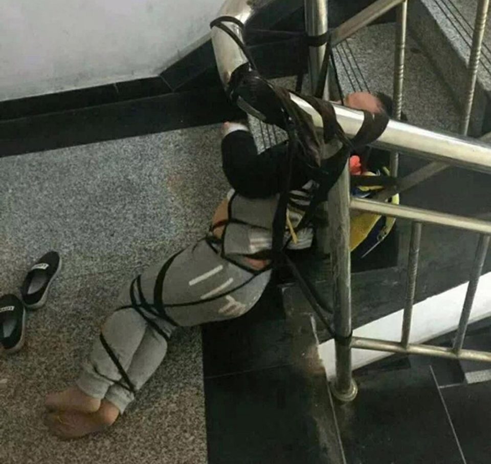 ▼中國湖南省耒陽市的一位母親把小孩綁在樓梯間,小孩嚇到哭泣吶喊,表情非常痛苦,褲子內部還有排泄物。但這位母親沒有給他鬆綁,而是把照片擷取下來,發給遠在廣東的前夫,向他索取贍養費。