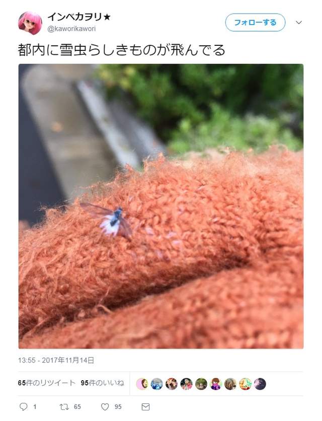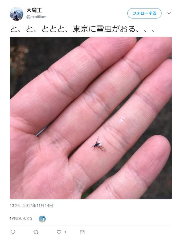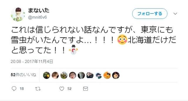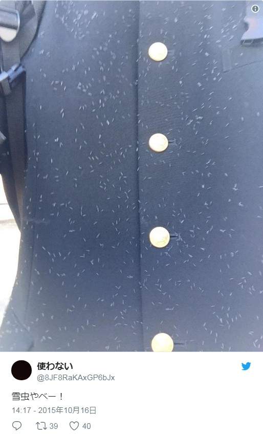 2017年11月20日去年11月的東京,降下了暌違54年的初雪,讓許多日本網友和遊客都大為感動。結果今年的11月中,在推特上就出現了許多網友分享他們在東京內目睹的神秘生物「雪蟲」,讓許多網友都騷動了,難道今年11月東京又要罕見的降雪了嗎?(以下有蟲子特寫照片,害怕昆蟲者慎入)