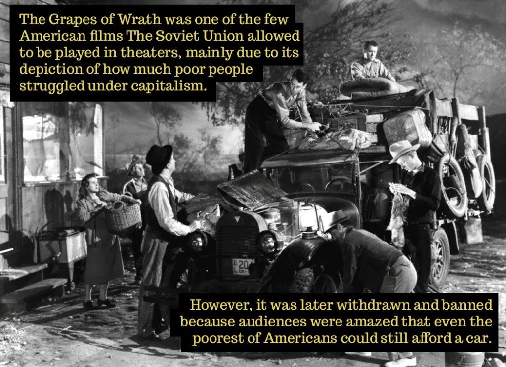 ▼電影《憤怒的葡萄》是蘇聯唯一允許在戲院播映的美國電影,因為電影描述了資本主義對窮人的壓榨。但後來這部電影也被列為禁片,因為片中最窮困的美國民眾都有能力買車。