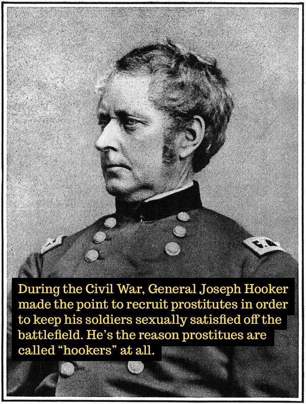 ▼美國內戰期間,喬瑟夫虎克將軍決定召募娼妓來滿足士兵們的性欲。娼妓在國外普遍被稱為「hookers」(虎克),就是這個原因。