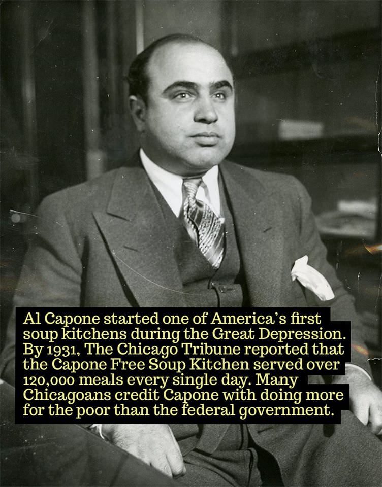 ▼大蕭條時期,艾爾卡彭創立了美國第一間慈善廚房。1931年,芝加哥論壇報報道,這間慈善廚房每天供應超過12萬份餐點,很多芝加哥民眾都認為卡彭對貧戶的貢獻比政府更有作為。