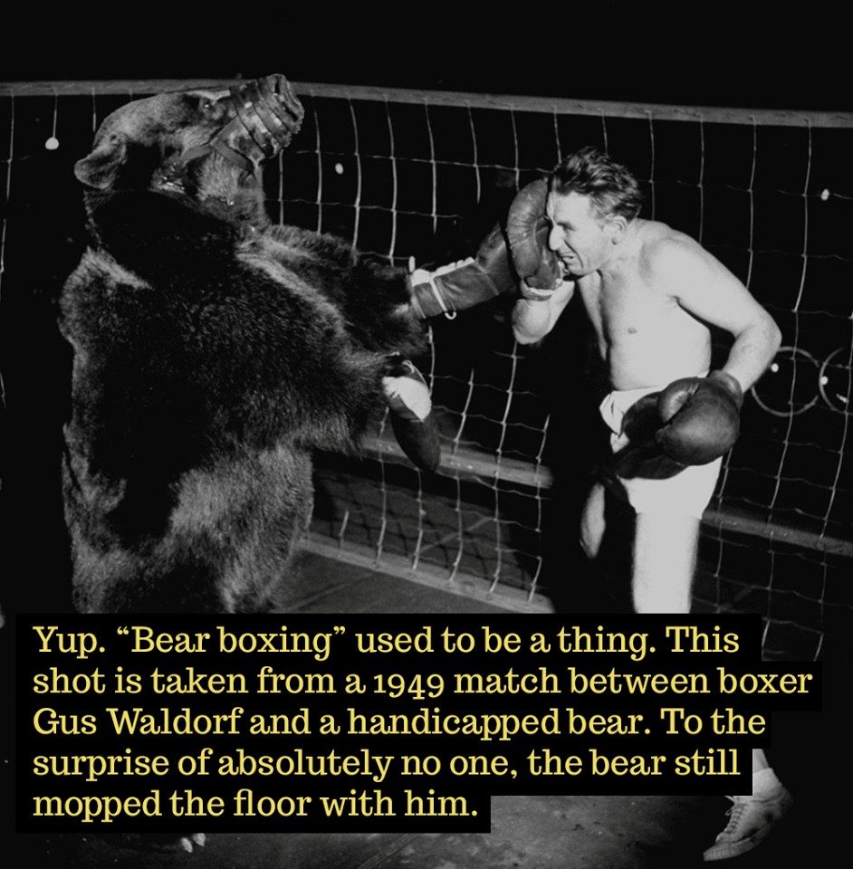 ▼黑熊拳擊曾經風靡一時。這是1949年進行的一場拳擊賽,拳擊手古斯華多夫與一隻殘疾熊對打,最後熊贏了。