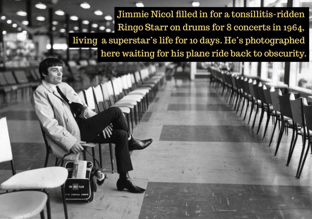 ▼1964年,披頭四鼓手林哥史塔扁條線發炎,鼓手吉米尼寇代打了8場演出,也體驗了10天的巨星生活。照片中的他正在機場等待重返默默無名的人生。