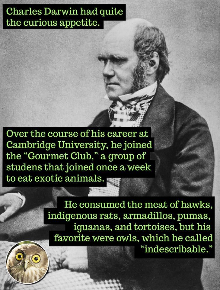 ▼達爾文的胃口很怪,在劍橋大學任職期間,他加入了「饕客社團」,社員們每周都會聚在一起吃野生動物。據說他吃過老鷹、老鼠、犰狳、美洲獅、鬣蜥、陸龜。他最愛的是貓頭鷹肉,還說超級美味,無法用文字形容。