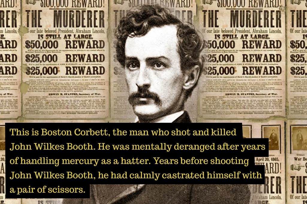 ▼波斯頓寇比開槍射殺了刺殺肯尼迪總統的約翰威爾克斯布思。波斯頓寇比是帽商,因為長期接觸汞,所以精神失常。射殺約翰威爾克斯布思幾年後,他用剪刀閹割了自己。
