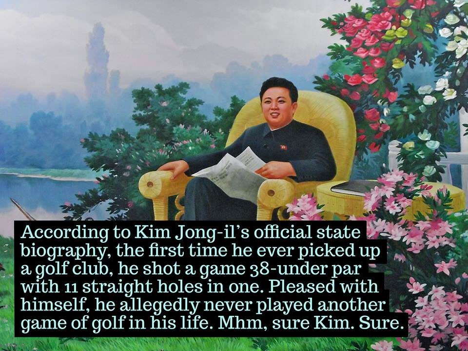 ▼金正日的官方自傳中說,他第一次玩高爾夫球就以低於38標準桿一桿進洞11次。他對自己的表現太滿意,這輩子再也沒有玩過高爾夫球。