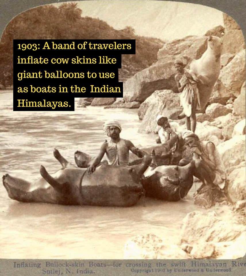 ▼1903年,旅人朝牛皮內吹氣,用來當橫渡喜馬拉雅山脈河流的救生船。