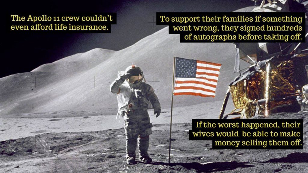 ▼阿波羅11號的組員們連人壽保險都負擔不起,為了防止在任務中喪命,讓家人無依無靠,他們升空前準備了數百份簽名,如果發生意外,家人還能靠那些簽名賣錢。