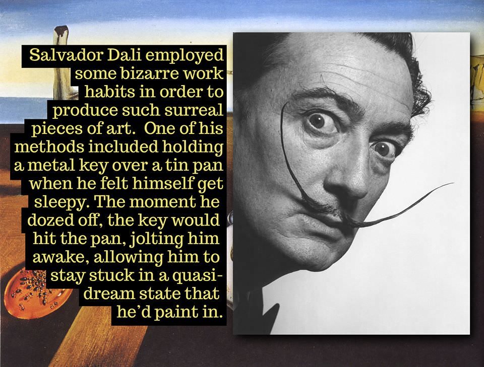 ▼為了創作出超現實的藝術作品,達利的工作習慣很怪異,他會在半夢半醒的狀態下作畫。每次想睡覺,他就在錫盤邊舉起一把金屬鑰匙,還打瞌睡的話,鑰匙就會撞擊錫盤發出聲響,把他吵醒。