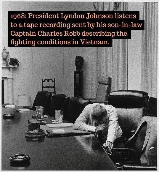 ▼1968年,美國總統林登詹森正在聽取女婿查爾斯羅伯上尉寄來的一卷錄音帶,錄影帶中是關於越戰戰況的口述。