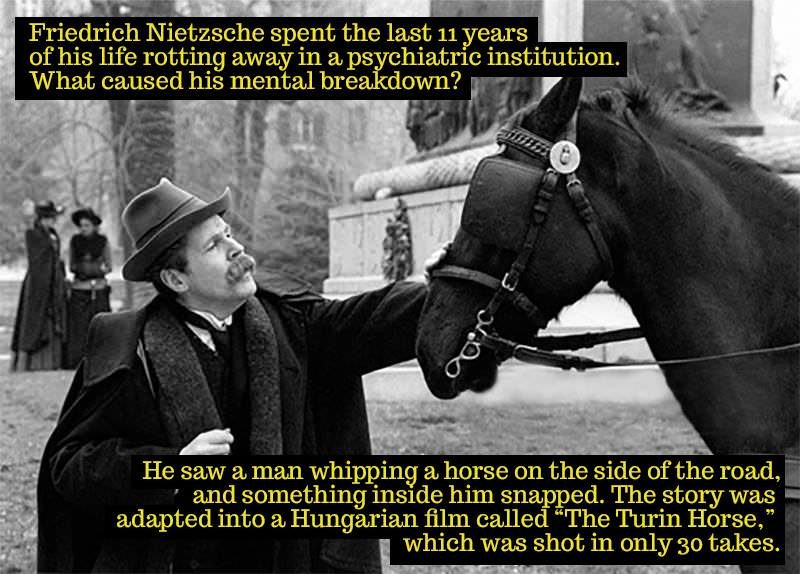 ▼哲學家尼采人生的最後11年都待在一間精神病院。據說他看到一名男子在路邊抽打一匹馬,理智當場斷線,精神出了問題。前幾年匈牙利電影大師貝拉塔爾 (Béla Tarr) 將這件事翻拍成了電影《都靈之馬》,全片只有30個鏡頭。