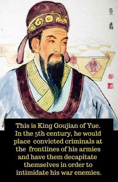 ▼西元5世紀,中國春秋時代後期的越國君主勾踐,將死刑犯安置在軍隊的最前排,讓他們砍下自己的頭來嚇唬敵人。