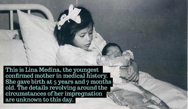 ▼琳娜梅迪納是醫學史上最年輕的媽媽,她5歲7個月大時生下了小孩,但誰也不知道孩子的爸爸是誰。