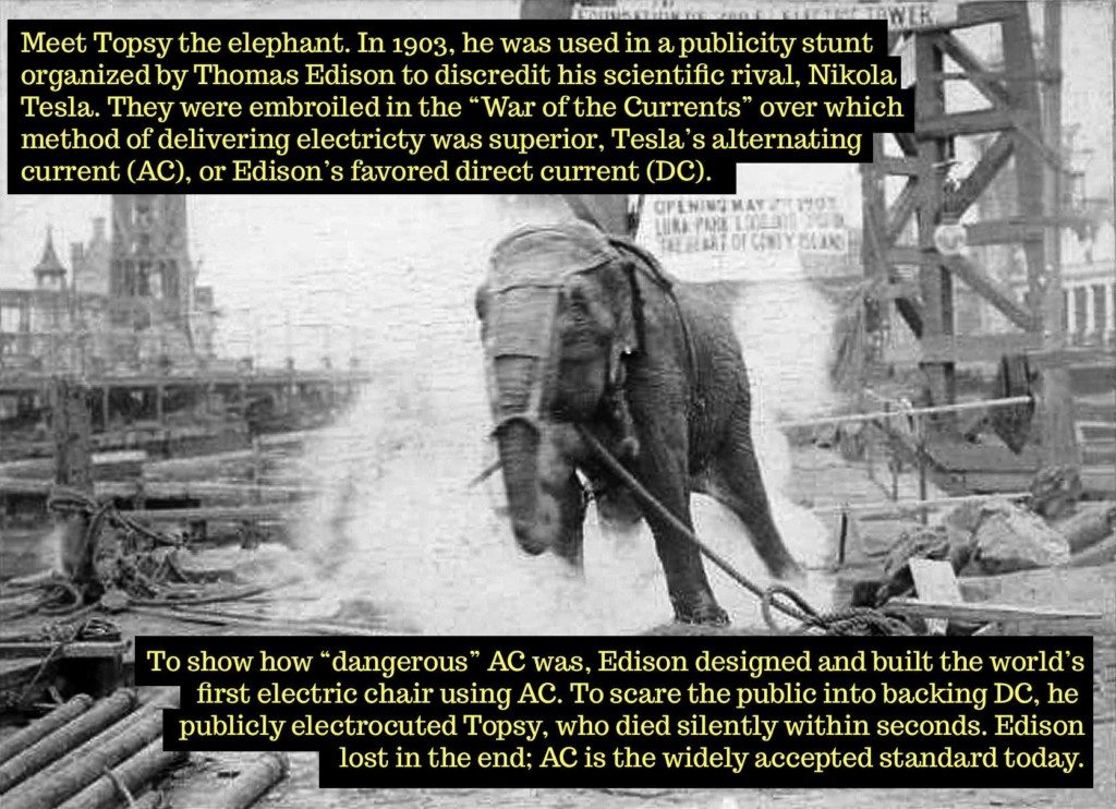 ▼1903年時,湯瑪斯艾迪森用大象「托普希」進行了一場公開表演,目的是為了敗壞尼可拉特斯拉的名聲。尼可拉特斯拉是艾迪森的死對頭,他倡導交流輸電系統,艾迪森推廣直流輸電系統,兩人還上演了一場名為「電流戰爭」的 商業鬥爭。